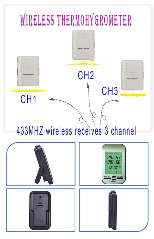 Een ontvanger binnen kan temperatuur en vochtigheid vanuit drie verschillende hoeken bekijken. 433MHZ ontvangt draadloos 3-kanaal data, geen obstakels en geen interferentie binnen 100 meter.