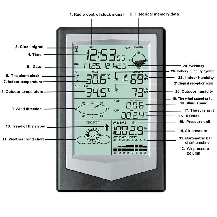 Een buitenzender, een binnen LCD-ontvanger, een handleiding, een pakket bevestigingsschroeven voor de buitenzender